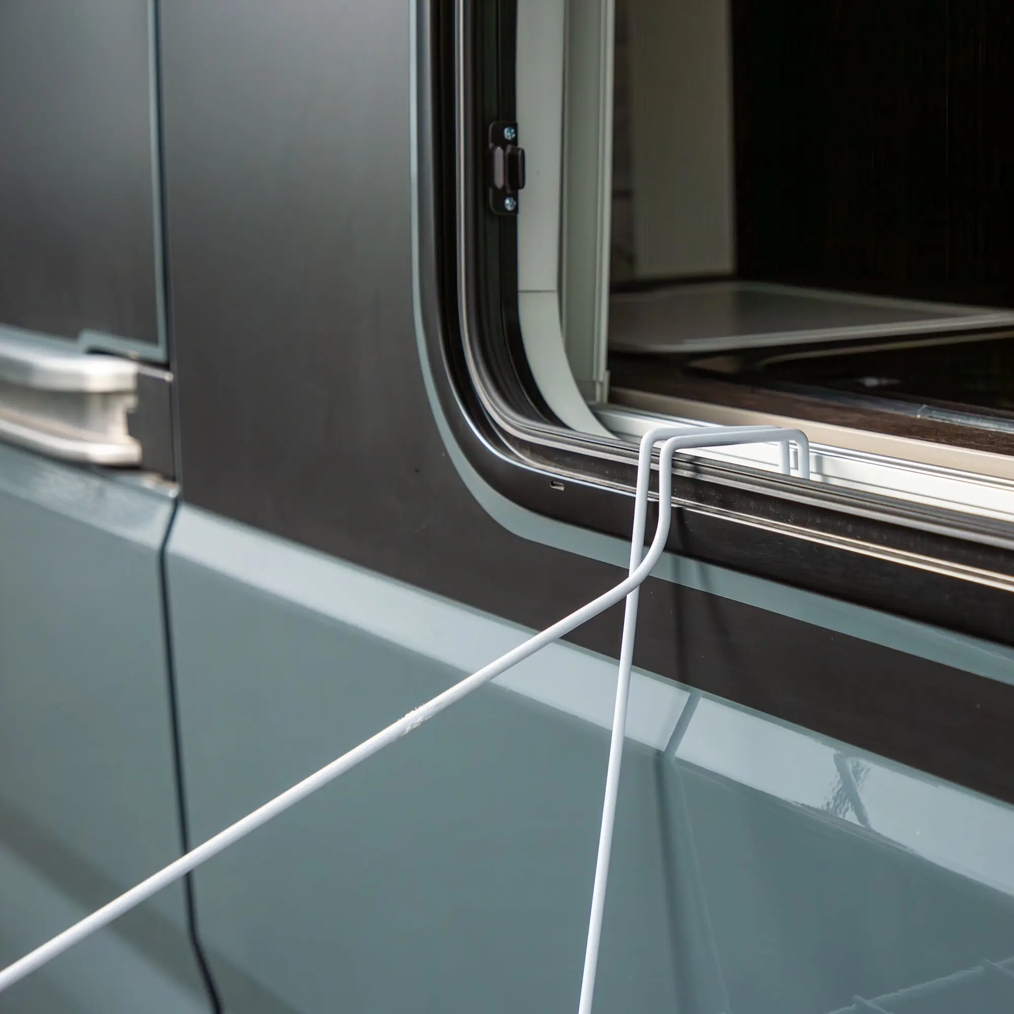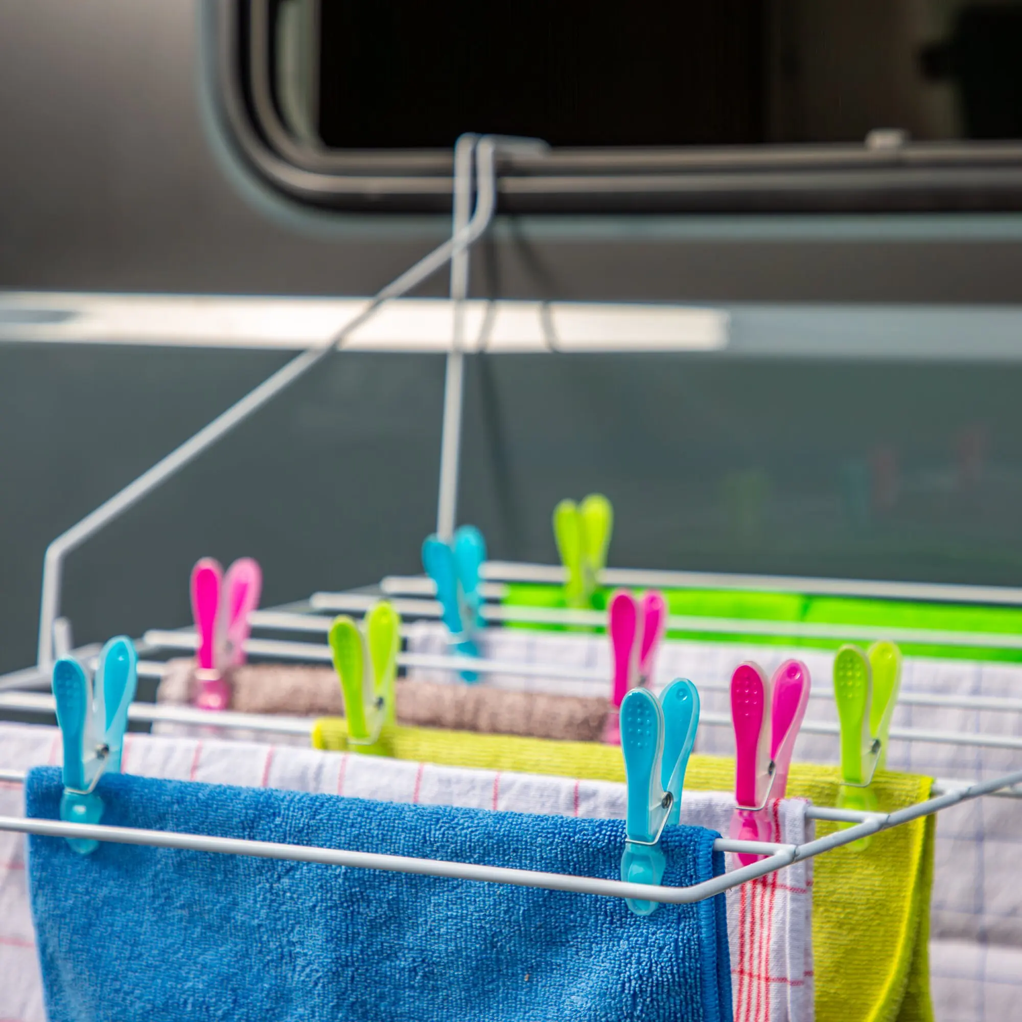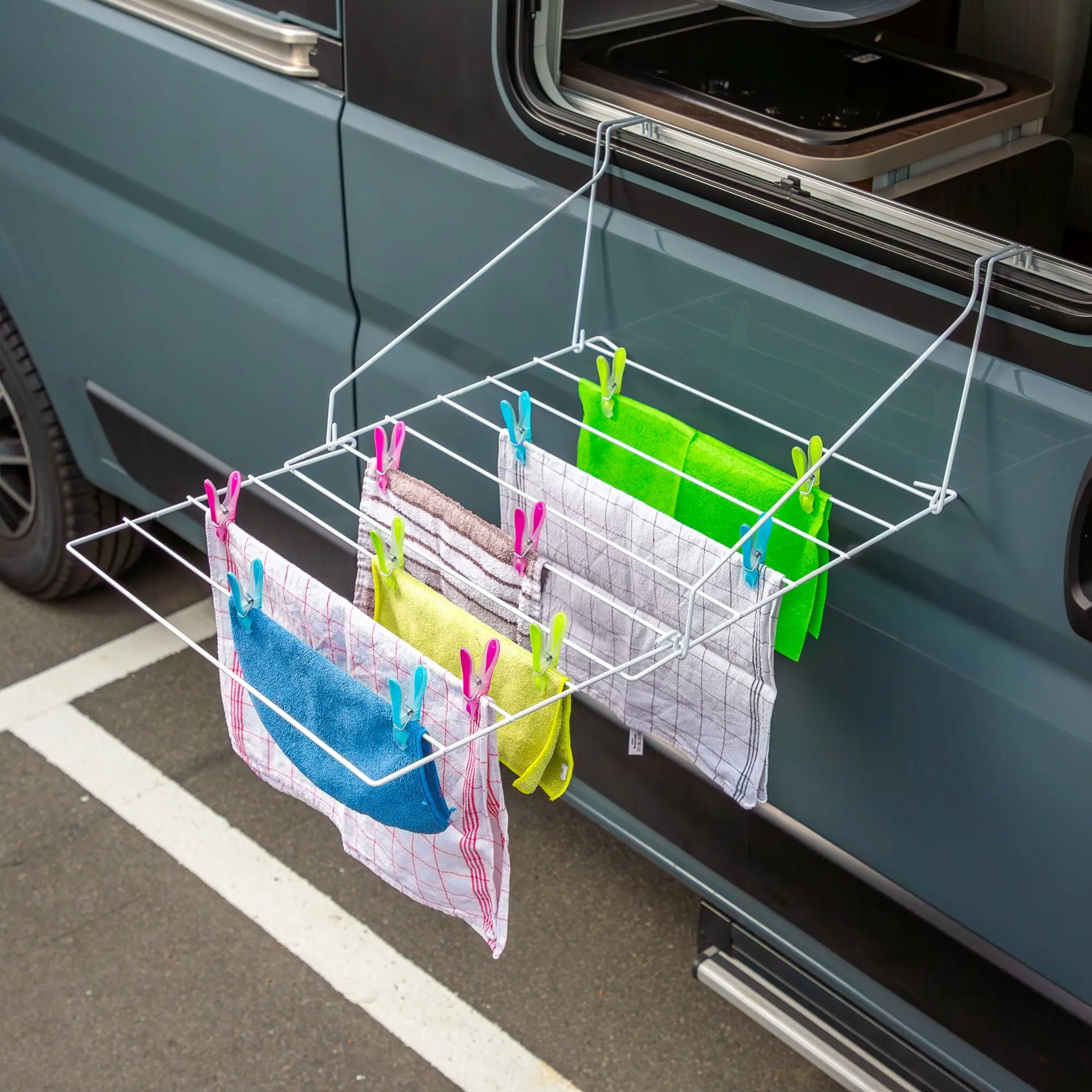 Bewährter Wäschetrockner für dein Wohnwagenfenster, den Ziehgriff oder auch für den Balkon. Ersetzt eine ca. 5,4 m lange Leine. Rostsicher durch Kunststoffummantelung.