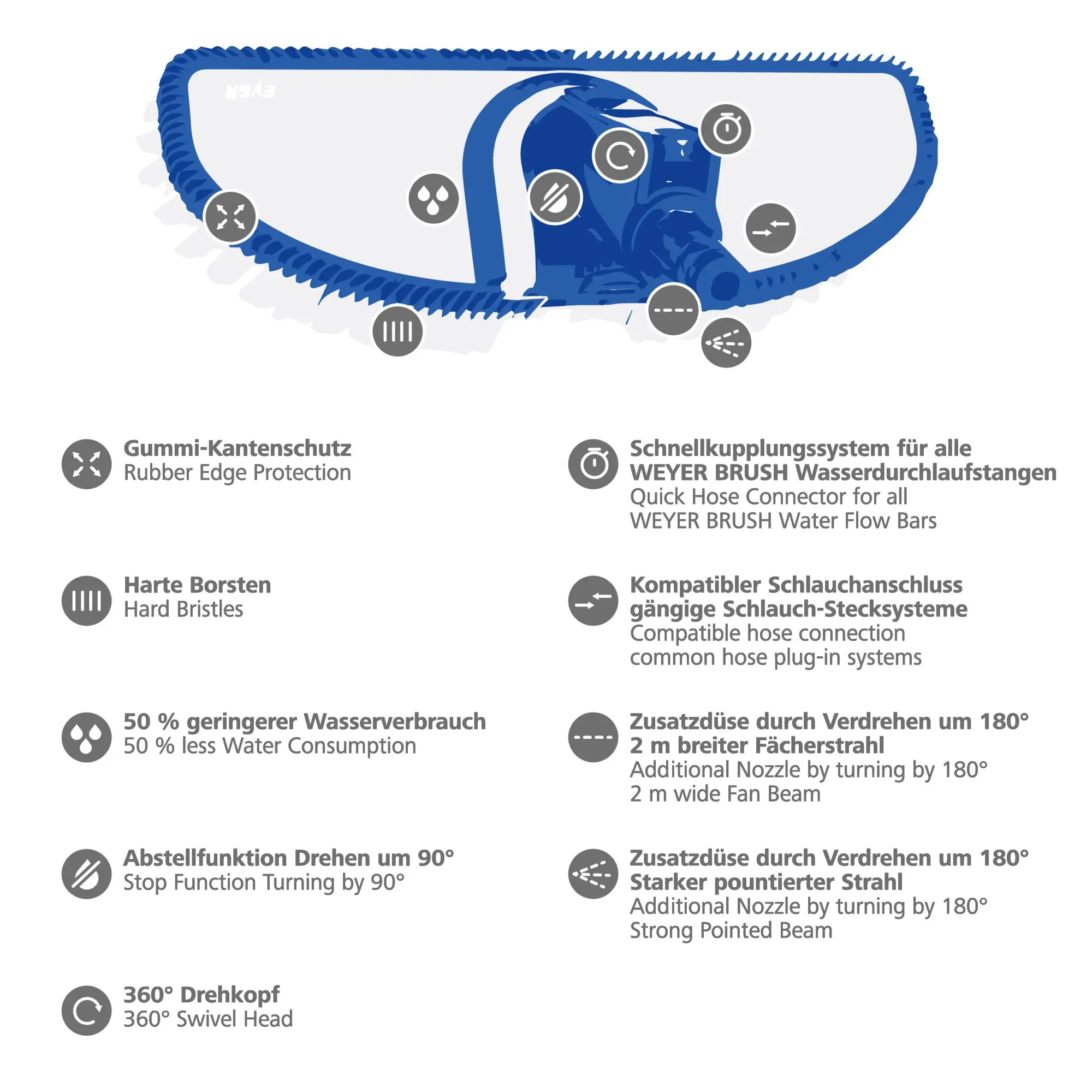Die Weyer Brush Waschbürste mit Schlauchanschluss besticht durch ihre hochwertige Verarbeitung, die einfache Handhabung und die Vielzahl innovativer Funktionen: