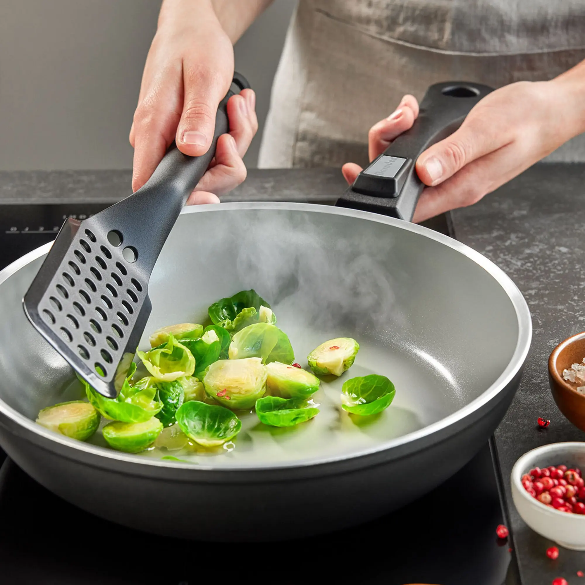 Dank des abnehmbaren Stiels (separat erhältlich, Art-Nr. 310/539) kann der Wok besonders platzsparend verstaut und sogar im Backofen verwendet werden. Der Vollflächeninduktionsboden gewährleistet eine optimale Hitzeverteilung auf allen Herdarten, perfekt geeignet auch für Multizonen-Induktionsfelder. Außerdem ist die Pfanne mit der PFAS-freien Quarz-Versiegelung b.nature ausgestattet und hat dadurch eine ausgezeichnete Antihaftwirkung.
