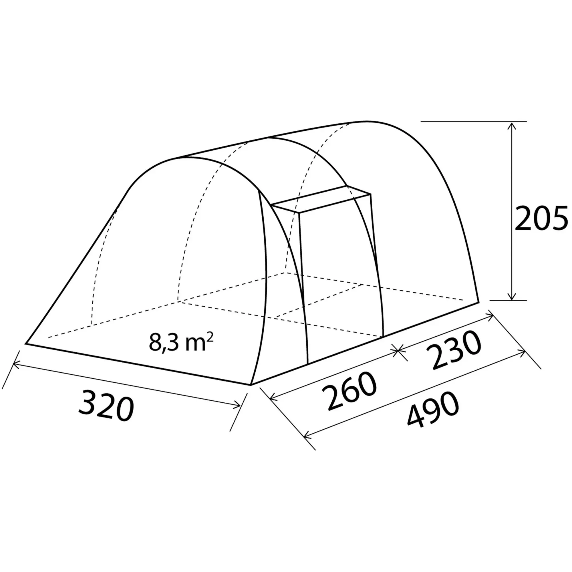 - Innenzeltmaße: B (120 + 180) x H 195 x T 220 cm
